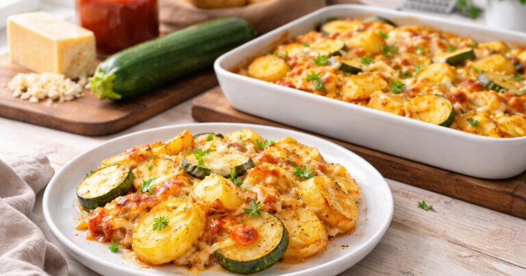 Zapékání patří k těm kuchařským technikám, které si člověk zamiluje hlavně ve chvíli, kdy nechce stát dlouho u plotny, ale zároveň touží po poctivém, sytém jídle. Kombinace brambor a cukety má v domácí kuchyni dlouhou tradici napříč Evropou – jednoduché suroviny, které byly vždy po ruce, se vrství, dochucují a nechávají pomalu spojit v jeden harmonický celek. Právě tahle nenápadná dvojice je důkazem, že bezmasá jídla rozhodně nemusí být kompromisem. Naopak, když se doplní o sýr, rajčata a krémovou jogurtovo-vaječnou zálivku, vznikne pokrm, který je chuťově plný a překvapivě uspokojivý.