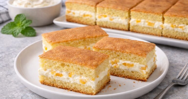 Zajímavým nápadem na dobrotu ke kávě je dezert, který v sobě kombinuje svěží citronový korpus a jemný smetanový krém se sladkými kousky broskví. Je navíc tak jednoduchý, že ho zvládne i ten, kdo jinak běžně nepeče. Přesto na talíři působí velmi elegantně a svěže – přesně jako dezert, který si rádi dopřejete v teplém odpoledni na terase nebo při nedělní návštěvě.