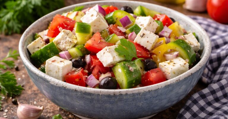 A na závěr jedna malá zajímavost o surovině, bez které by tenhle salát nikdy nebyl úplný – o fetě. Tenhle sýr se vyrábí už víc než dva tisíce let a ve starověkém Řecku patřil k běžnému jídlu. Připravuje se z ovčího a kozího mléka a zraje ve slaném nálevu, který mu dává jeho typickou chuť. Je lehce slaný, jemně pikantní a s čerstvou zeleninou si rozumí úplně přirozeně – žádná z chutí nepřebíjí tu druhou, spíš spolu hezky ladí.