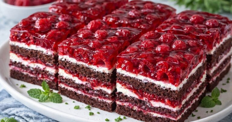 Nadýchané malinové řezy patří mezi dezerty, které dokážou upoutat pozornost ještě dřív, než se vůbec ochutnají. Jemný kakaový korpus, svěží malinová vrstva, lehký krém a lesklé ovocné želé vytvářejí kombinaci, která působí luxusně, ale přitom zůstává příjemně domácí. Jsou to přesně ty řezy, které se hodí nejen na víkendový stůl ke kávě, ale i na narozeninovou oslavu, svatbu nebo slavnostní setkání s rodinou.