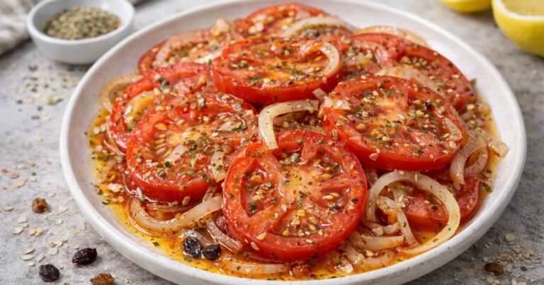 Podobné způsoby nakládání zeleniny mají své kořeny ve středomořské a balkánské kuchyni, kde se využívala přirozená sladkost zralých rajčat v kombinaci s kyselinou, olejem a kořením. Cílem nebylo jen uchování, ale hlavně rozvinutí chuti. A přesně to se děje i tady – jednotlivé vrstvy rajčat, cibule a dresingu se postupně propojí, změknou a vytvoří chuťový celek, který působí mnohem bohatěji, než byste čekali od několika základních surovin.