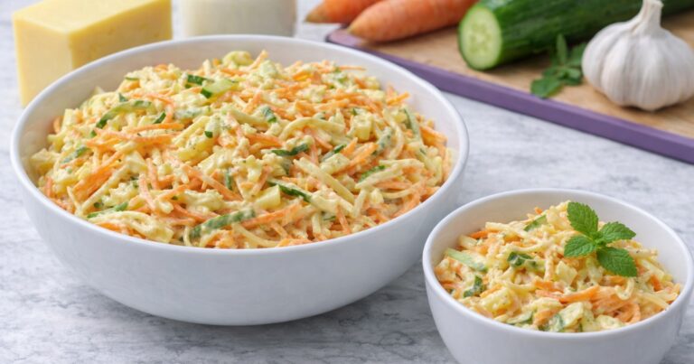 Tenhle jednoduchý mrkvový salát patří přesně k těm receptům, které nevznikly proto, aby ohromovaly technikou, ale aby prostě fungovaly. Je rychlý, dostupný a přitom chuťově překvapivě vyvážený. Kombinace křupavé zeleniny, jemně pikantního česneku a sýra spojeného majonézou připomíná domácí studenou kuchyni, jak ji známe z rodinných oslav, chlebíčků nebo rychlých večeří po dlouhém dni. Právě v té nenápadnosti je jeho síla – nic si na nic nehraje, a přesto se k němu člověk rád vrací.