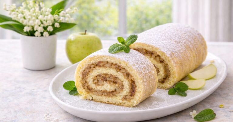 Piškotová roláda s jablky je přesně ten druh dezertu, který vzniká nenápadně, ale zůstane v paměti. Často začíná úplně obyčejně – pár pěkně zralých jablek v míse, chuť na něco sladkého a potřeba upéct něco, co potěší celou rodinu. Právě tahle jednoduchost jí dává kouzlo. Lehký piškot, šťavnatá jablečná vrstva a jemná vůně vanilky vytvářejí moučník, který není těžký, nepůsobí přehnaně sladce a přesto má v sobě vše, co si od domácího pečení člověk přeje.