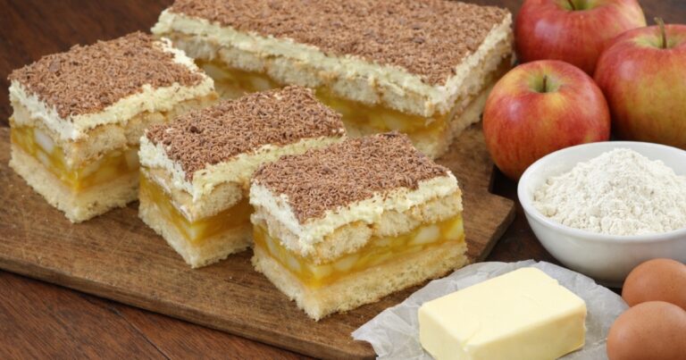 Tenhle dezert patří k těm, které si člověk zapamatuje ne podle složité přípravy, ale podle chuti. Spojení jemného piškotového korpusu, šťavnatých jablek, hebkého pudinkového krému a lehce rozlámaných cukrářských piškotů vytváří harmonii, která funguje napříč generacemi. Je to typ sladkosti, která se hodí jak na rodinnou oslavu, tak na obyčejné nedělní odpoledne, kdy máte chuť na něco poctivého a uklidňujícího. Dezert působí elegantně, ale zároveň domácky – nic nepřebíjí nic jiného, chutě jsou vyvážené a přirozené.