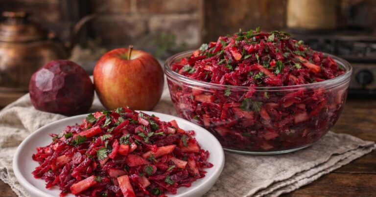 Navíc je to jeden z těch salátů, které na talíři prostě vypadají hezky. Ta hluboká červená barva řepy v kombinaci se světlými kousky jablka a zelenou petrželkou působí svěže, čistě a lákavě. Je radost ho servírovat a ještě větší radost ho jíst.