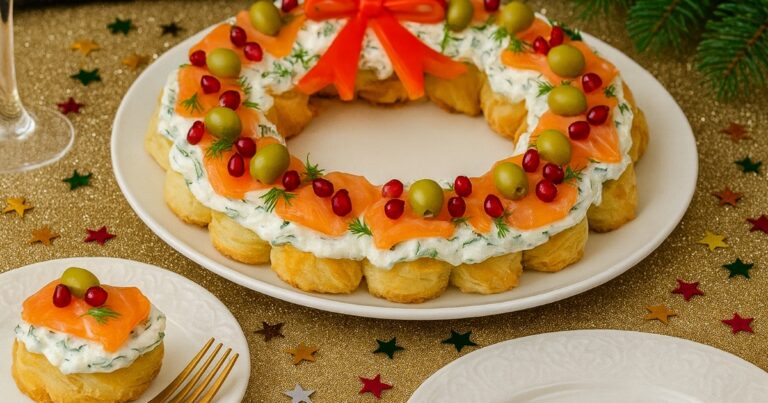 Slaný vánoční věnec s lososem je přesně ten typ pohoštění, který vypadá krásně, chutná skvěle a přitom se připravuje úplně v klidu. Je to taková jedlá dekorace – kulatý tvar evokuje vánoční věnec, barevné ozdoby dodají slavnostní vzhled a chuťově je to kombinace, která se prostě neomrzí. Jemný sýr, kvalitní losos, svěží kopr… a hotovo.