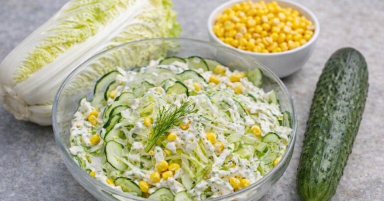 Když se nám nechce vařit nic složitého, ale zároveň máme chuť na něco, co bude chutnat dobře a tělo po tom nebude unavené. Přesně pro takové chvíle je tento salát. Je jednoduchý, svěží, barevný a překvapivě uspokojivý. Křehké pekingské zelí, šťavnatá okurka a jemně sladká kukuřice se potkávají s krémovým dresinkem, který všechno krásně propojí. Ať už ho připravíte jako rychlou večeři, lehkou svačinu nebo přílohu k hlavnímu chodu, vždycky splní svůj účel.